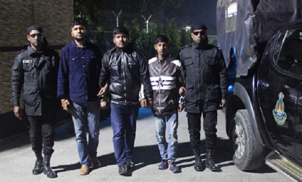 আটককৃতরা হচ্ছে, বগুড়া জেলার ধূনট থানার বাড়িয়া গ্রামের মৃত তাজুল ইসলামের ছেলে মো. তরিকুল ইসলাম ওরফে রাজীব (৩১), ঝিনাইদহ জেলার শৈলকূপা থানার ইব্রাহিমপুরের মো. জাফর আলতাফের ছেলে বিশ্বাস মোহাম্মদ আসিফ আফরোজ মৌসুম (২৩) ও জামালপুর জেলার ইসলামপুর থানার নাইপতার চড়ের মৃত মোনা হোসেনের ছেলে মো. মনির (২১)।