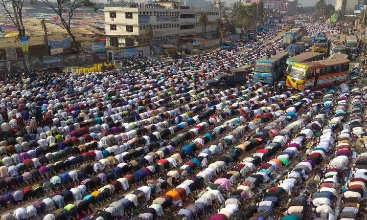 অনুকূল আবহাওয়া, শান্তিপূর্ণ পরিবেশ ও ধর্মীয় উদ্দীপনায় ইজতেমার পক্ষ-বিপক্ষ মতাদর্শী মুসল্লিদের অংশগ্রহণ ও কঠোর নিরাপত্তার মধ্য দিয়ে গতকাল শুক্রবার বাদ ফজর আমবয়ানের মধ্য দিয়ে শুরু হয়েছে বিশ্ব ইজতেমার প্রথম পর্ব। ইমান, আমল ও আখলাক, দাওয়াত ও তাবলীগ সম্পর্কে তাবলীগি বুজুর্গ, ইসলামি চিন্তাবিদ, আলেম ও পাকিস্তানের মাওলানা খোরশেদ আলমের আমবয়ানের মধ্য দিয়ে শুরু হয় আলমি শুরার তত্ত্বাবধানে প্রথম পর্ব। রাজধানী ঢাকার উপকণ্ঠ টঙ্গীর তুরাগ নদের তীরে তাবলীগ জামাতের বার্ষিক মহাসম্মেলন বিশ্ব ইজতেমার প্রথম দিনে গতকাল অনুষ্ঠিত হয় বিশ্বের বৃহত্তম জুমার জামাত। ইজতেমায় অংশগ্রহণকারী লাখ লাখ মুসল্লি­­ ছাড়াও রাজধানীসহ পার্শ্ববর্তী এলাকার হাজার হাজার মানুষ রেলপথ, সড়কপথ, নৌপথসহ বিভিন্ন যানবাহনে করে এবং অনেকে পায়ে হেঁটে শরিক হন এই বৃহত্তম জুমার জামাতে। বিশ্বের অর্ধশতাধিক দেশের দুই সহস্রাধিক প্রতিনিধিসহ লাখো মুসল্লি­র অংশগ্রহণে অসীম, অনন্ত ও প্রেমময় আল্লাহর সন্তুষ্টি অর্জনে ইবাদত-বন্দেগি আর কোরআন-হাদিসের আলোচনায় বিশ্ব ইজতেমার বিশাল প্যান্ডেলে পবিত্র ধর্মীয় পরিবেশ বিরাজ করছে। আগামীকাল (রোববার) দুপুরের আগে আখেরি মোনাজাতের মধ্য দিয়ে ধর্মপ্রাণ মুসলমানদের দ্বিতীয় বৃহত্তম এই ধর্মীয় মহাসমাবেশের প্রথম পর্ব শেষ হবে। গতকাল সকাল থেকেই সর্বস্তরের মুসলমানরা জুমার জামাতে শামিল হওয়ার জন্য টুপি, পাঞ্জাবি পরে জায়নামাজ হাতে ইজতেমা মাঠের দিকে ছুটতে দেখা গেছে। দেশ-বিদেশের মুসল্লির সঙ্গে একই জামাতে শরিক হয়ে নামাজ আদায় করার মাধ্যমে বেশি সওয়াব হাসিলের উদ্দেশ্যে সবার মধ্যে দেখা গেছে ব্যাকুলতা। শিশু-কিশোর থেকে শুরু করে সব বয়সি মানুষের সমাবেশ ঘটে জুমার জামাতে। টঙ্গী, উত্তরা, কামারপাড়া, মিরপুর, আব্দুল্ল­াপুরসহ আশপাশের এলাকার মসজিদে গতকালের জুমার জামাতে মুসল্লির সংখ্যা ছিল অপ্রতুল। ইজতেমা মাঠে জুমার জামাত সুবিশাল প্যান্ডেলের গণ্ডি ছাড়িয়ে বিস্তৃতি লাভ করে চারপাশে। টঙ্গীর যেদিকে দৃষ্টি যায়, শুধু টুপি-পাঞ্জাবি পরা মুসল্লিদের দেখা মেলে। পুরো টঙ্গী নগরী যেন টুপি-পাঞ্জাবি পরা মানুষের নগরে পরিণত হয়েছে। মাঠে স্থান না পেয়ে অনেকে মহাসড়ক, অলি-গলিসহ যে যেখানে পেরেছেন পাটি, চটের বস্তা, খবরের কাগজ বিছিয়ে জুমার নামাজে শরিক হয়েছেন। ফলে ঢাকা-ময়মনসিংহ মহাসড়কে বেশ কিছুক্ষণের জন্য যানবাহন চলাচল বন্ধ হয়ে যায়। দুপুর ১টা ৪৫ মিনিটে শুরু হওয়া জুমার জামাতে ইমামতি করেন বাংলাদেশের তাবলীগ জামাতের শুরা সদস্য, শীর্ষ মুরব্বি, কাকরাইল মসজিদের খতিব মাওলানা মোহাম্মদ যোবায়ের আহমদ। জুমার নামাজের পর বয়ান করেন মাওলানা শেখ ইউনুস, বাদ আসর বয়ান করেন পাকি