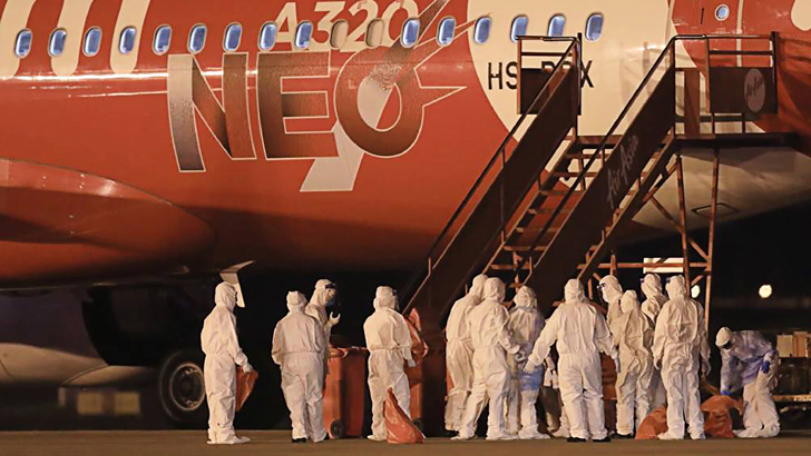 This handout from the Royal Thai Navy taken and released on February 4, 2020 shows navy officials in protective suits standing beside a plane that brought Thai nationals back from Wuhan, the epicentre of the novel coronavirus outbreak, at U-Tapao Airport in Rayong. (Photo by Handout / various sources / AFP) / -----EDITORS NOTE --- RESTRICTED TO EDITORIAL USE - MANDATORY CREDIT "AFP PHOTO / ROYAL THAI NAVY " - NO MARKETING - NO ADVERTISING CAMPAIGNS - DISTRIBUTED AS A SERVICE TO CLIENTS