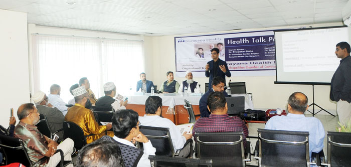 হৃদরোগ বিশেষজ্ঞ ডা. দেবী শেঠির নারায়না হেলথ ইন্ডিয়া এর কার্ডিওলজি বিভাগের বিশেষজ্ঞ ডা. প্রিয়াংকার সিনহা বলেন, গর্ভাবস্থায় এবং বৃদ্ধ বয়সে হার্টের বাল্বের সমস্যায় কিভাবে স্বাভাবিক জীবন যাপন করা যায় এ বিষয়ে গুরুত্বপূর্ণ তথ্য প্রদান করেন। এছাড়াও উন্নত চিকিৎসা ব্যবস্থার মাধ্যমে হার্টের বাল্বের প্রতিস্থাপন এখন সীমিত সময়ের মধ্যেই করা সম্ভব বলে তিনি জানান। আলোচনা সভায় কিডনি রোগের নানাবিধ ঝুকি নিয়ে কথা বলেন নারায়ানা হসপিটালের কিডনি বিভাগের বিশেষজ্ঞ ডা. ইশতিয়াক আহমেদ। তিনি বলেন অপরিকল্পিত খাদ্যভাস, অপরিকল্পিত জীবন যাপনের কারনে কিডনি রোগীর সংখ্যা দিন দিন বেড়েই চলেছে। সেসব রোগীদের মধ্যে অনেকেই কিডনি বিকল হওয়ায় কিডনি প্রতিস্থাপনের দিকে ঝুকছে। কিডনি প্রতিস্থাপন খুবই ঝুকিপূর্ণ এবং সময়সাপেক্ষ বলে এর থেকে পরিত্রাণ পেতে হলে পরিকল্পিত জীবন যাপন এবং খাদ্যভাসের ব্যাপারে গুরুত্বপূর্ণ ভূমিকার কথা বলেন।