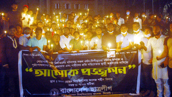 নোয়াখালী নারী নির্যাতনের ঘটনা সহ সকল ধর্ষন-নিপীড়নের ঘটনায় সম্পৃক্ত ও পৃষ্ঠপোষকদের দ্রুত গ্রেফতার ও নারীদের প্রতি সহিংসতার স্থায়ী অবসান এবং ধর্ষকের সর্বোচ্চ শাস্তি ফাঁসির দাবীতে মদন মোহন কলেজ ছাত্রলীগের উদ্যোগে আলোক প্রজ্জ্বলন করা হয়েছে।