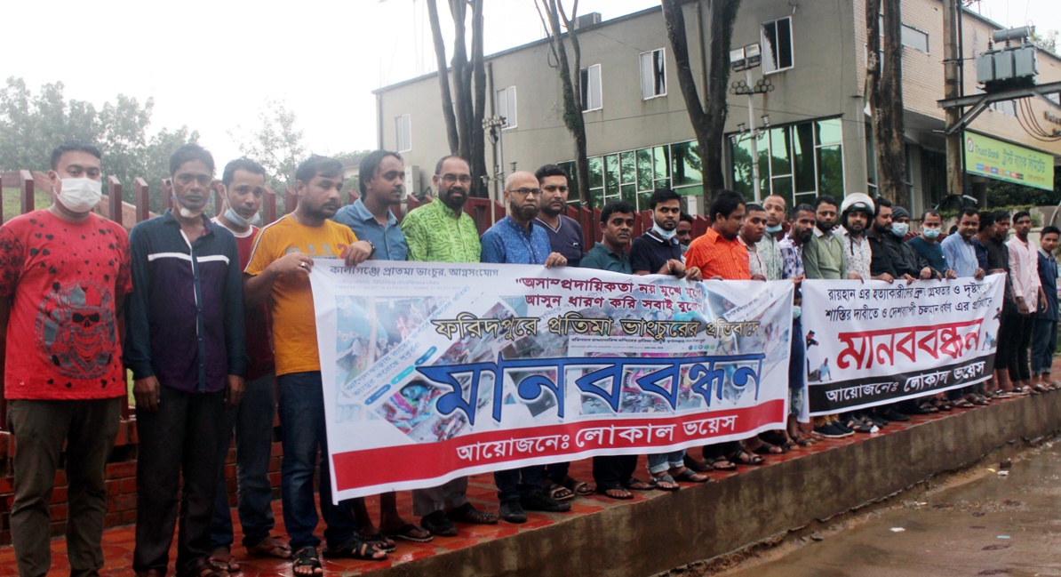 ফরিদপুরে প্রতিমা ভাংচুরের প্রতিবাদে লোকাল ভয়েস সিলেটের মানববন্ধন