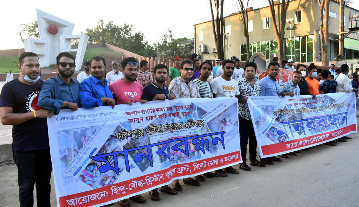 ফরিদপুরে প্রতিমা ভাংচুরের প্রতিবাদে হিন্দু-বৌদ্ধ-খ্রীস্টান যুব ফ্রন্টের মানববন্ধন