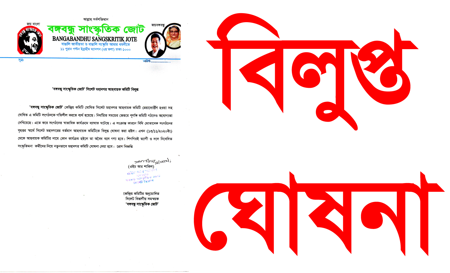 ১৩ নভেম্বর থেকে সিলেট মহানগর বঙ্গবন্ধু সাংস্কৃতিক জোট আহ্বায়ক কমিটির নামে কোন কার্যক্রম হলে তা অবৈধ বলে গণ্য হবে। শিগরই ত্যাগী ও দলের নিবেদিত সংস্কৃতিমনা কর্মীদের নিয়ে নতুনভাবে মহানগর কমিটি ঘোষণা দেওয়া হবে। বিজ্ঞপ্তি