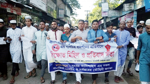 ফ্রান্সে হযরত মুহাম্মদ (সা:) এর ব্যাঙ্গচিত্র ও মুসলমানদের উপর অত্যাচারের প্রতিবাদে বৃহত্তর কানিশাইল ও দক্ষিণ কানিশাইল একতাবন্ধন ও লতিফিয়া ইসলামী সমাজকল্যাণ সংস্থার উদ্যোগে এক বিক্ষোভ মিছিল বের করা হয়েছে।