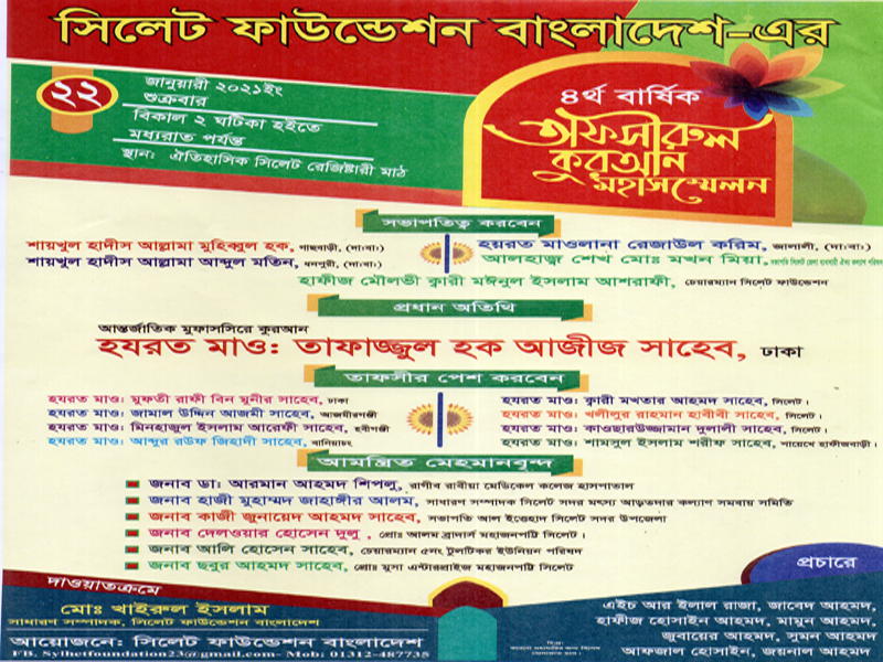 সিলেট ফাউন্ডেশন বাংলাদেশের ৪র্থ বার্ষিক তাফসীরুল কুরআন মহাসম্মেলন শুক্রবার