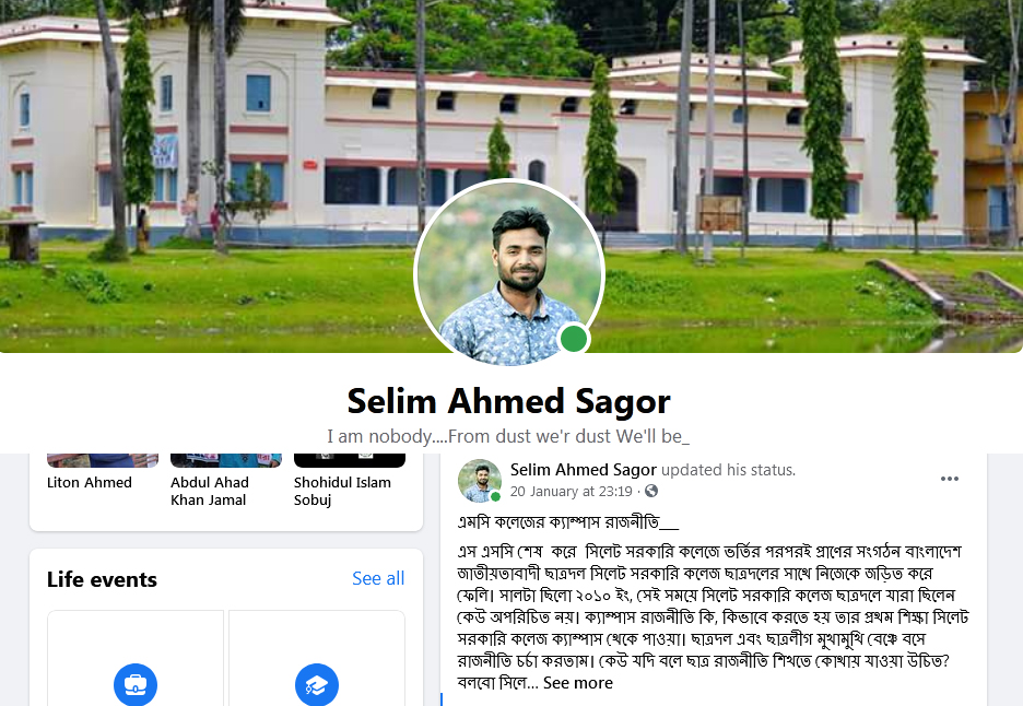 এমসি কলেজের ক্যাম্পাস রাজনীতি নিয়ে ছাত্রদল নেতা সেলিমের আবেগপ্রবণ স্ট্যাটাস