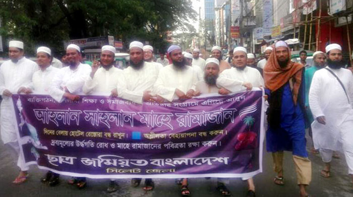 আসন্ন মাহে রামাজানের পবিত্রতা রক্ষা, অশ্লীলতা-বেহায়াপনা বন্ধ ও দিনের বেলায় হোটেল রেস্তোরা বন্ধ রাখা সহ ইসলাম বিরোধী সকল কার্যক্রম বন্ধের দাবীতে অনুষ্ঠিত জেলা ছাত্র জমিয়তের মিছিলটি নগরীর চৌহাট্টা পয়েন্টে এক পথ সভায় মিলিত হয়।