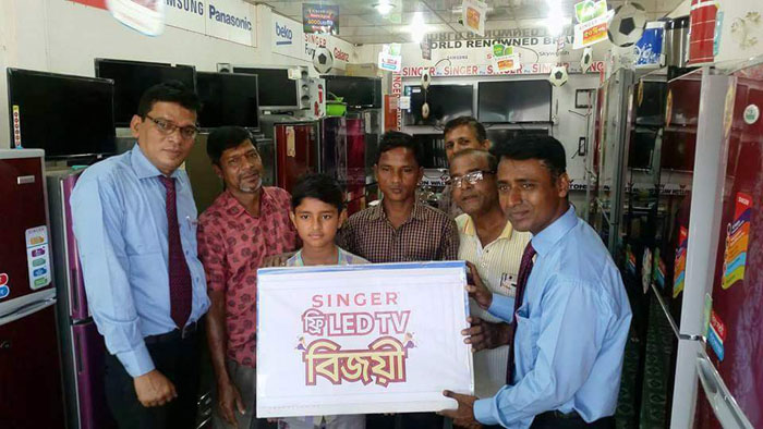 এসময় সিঙ্গার বাংলাদেশ লিমিটেড এ্যসোসিয়েট ট্যারিটরি অফিসার মোঃ রেজাউল করিম বলেন, বিশ্বকাপকে সামনে রেখে সিঙ্গার বাংলাদেশ লিমিডেট গ্রাহকদেরকে উৎসাহিত করণের লক্ষ্যে এসএমএস’র মাধ্যমে ১০০০ টি এলইডি টিভি পুরুস্কার ঘোষণা করেছে। এরই অংশ হিসেবে চান্দপুর গ্রামের প্রদীপ বর্মন এই পুরুস্কার লাভ করেছেন।