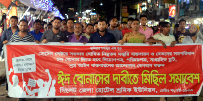 আগামী ২০ রমজানের মধ্যে যত বেতন তত ঈদ বোনাস প্রদানের দাবীতে সিলেট জেলা হোটেল শ্রমিক ইউনিয়ন রেজিঃ নং- চট্ট-১৯৩৩ এর উদ্যোগে বৃহস্পতিবার সন্ধ্যায় নগরীর সুরমা মার্কেট পয়েন্ট থেকে এক মিছিল বের হয়। মিছিলটি বিভিন্ন সড়ক প্রদক্ষিণ শেষে সিটি পয়েন্টে এসে সংক্ষিপ্ত সমাবেশে মিলিত হয়।