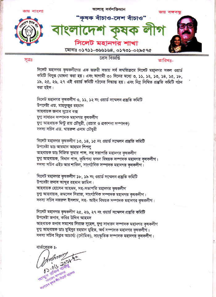 সিলেট মহানগর কৃষক লীগের সকল ওয়ার্ড কমিটি বিলুপ্ত ঘোষণা