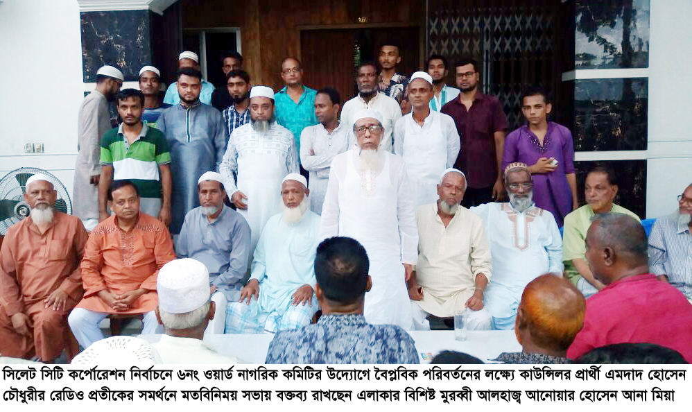 সিলেট সিটি কর্পোরেশন নির্বাচনে ৬নং ওয়ার্ড নাগরিক কমিটির উদ্যোগে বৈপ্লবিক পরিবর্তনের লক্ষ্যে কাউন্সিলর প্রার্থী এমদাদ হোসেন চৌধুরীর রেডিও প্রতীকের সমর্থনে এক মতবিনিময় সভা শুক্রবার বিকেলে পশ্চিম চৌকিদেখী ২নং রোর্ডের এক সমর্থকের বাড়ির সামনের উঠানে অনুষ্ঠিত হয়। সভায় বক্তারা বলেন, বার বার আমরা ধোকা খাচ্ছি। এবারের পরিবর্তনের লক্ষ্যে অবহেলিত ওয়ার্ডকে মাদক ও সন্ত্রাস মুক্ত করতে আগামী ৩০ জুলাই রেডিও প্রতীকে আপনাদের মহামূল্যবান ভোট দিয়ে জয়যুক্ত করুন।