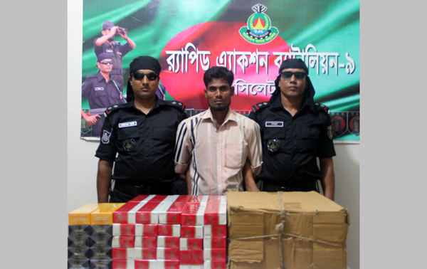 সিলেটের কানাইঘাট থানা এলাকা থেকে বিপুল পরিমান আমদানী নিষিদ্ধ বিদেশি সিগারেটসহ এক চোরাচালানকারীকে আটক করেছে র‌্যাব-৯।