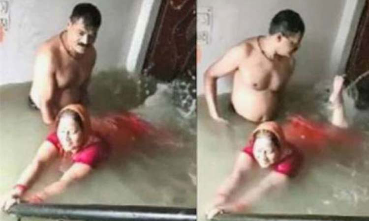 বন্যার পানিতে ঘরেই স্ত্রীকে সাঁতার শেখাচ্ছেন স্বামী !