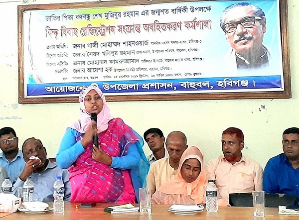 বাহুবল উপজেলা নির্বাহী কর্মকর্তা (ইউএনও) আয়েশা হক বলেছেন, মুসলমানদের পাশাপাশি হিন্দু বিয়েও নিবন্ধন বাধ্যতামূলক করা হয়েছে। এখন থেকে বাহুবল উপজেলায় সকল হিন্দু বিয়ে নিবন্ধন করতে হবে। অন্যথায় সংশ্লিষ্টদের বিরুদ্ধে আইনানুগ ব্যবস্থা গ্রহণ করা হবে।