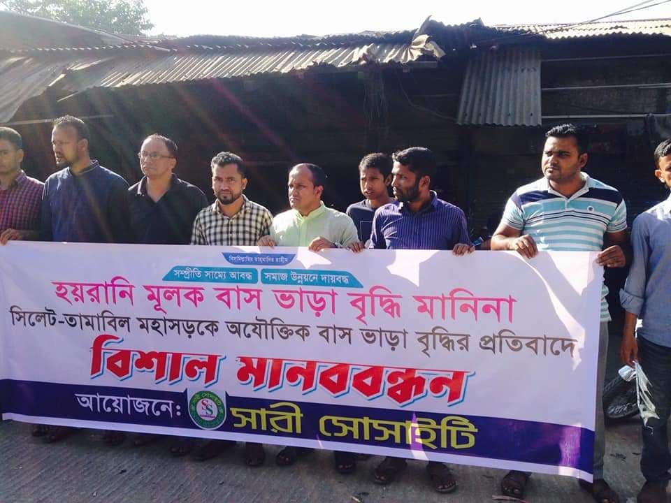 সিলেট-তামাবিল মহাসড়কে যাত্রী পরিবহন সেবার মান বৃদ্ধি না করে বাস মালিক সমিতি ও বাস চালক সমিতি কিলোমিটার প্রতি ১ টাকা ২০ পয়সা হারে ভাড়া বৃদ্ধির করার প্রতিবাদে সারী সোসাইটির উদ্যোগে জৈন্তাপুরে মানববন্ধন পালন করা হয়েছে। বুধবার বিকাল ৩টায় জৈন্তাপুর বাসস্টেশনে এ মানববন্ধন করা হয়।